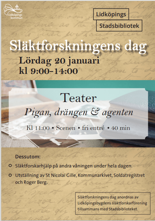 På lördag, den 20 januari är det Släktforskningens dag över hela Sverige. Vi träffas på biblioteket i Lidköping kl 9-14.